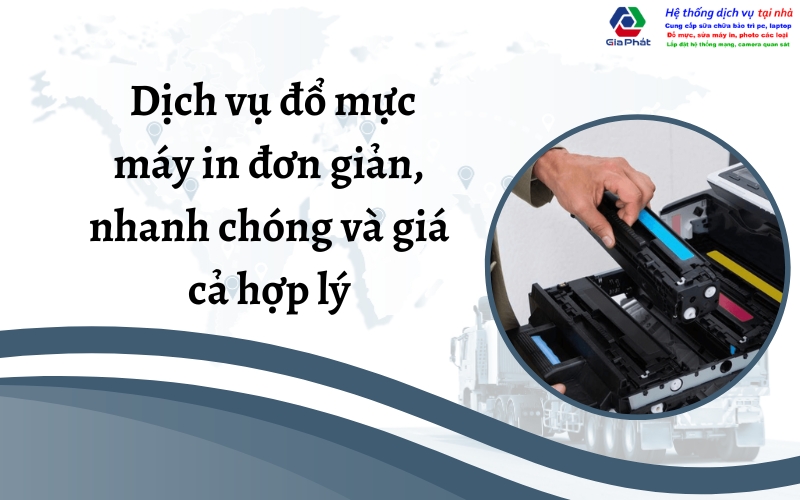 - Nếu bạn không có thời gian đến cửa hàng, Gia Phát cam kết cung cấp dịch vụ đổ mực tận nơi. Đội ngũ kỹ thuật viên của chúng tôi sẽ đến tận nơi, kiểm tra, đổ mực và bảo dưỡng máy in của bạn một cách chuyên nghiệp, nhanh chóng và thuận tiện.